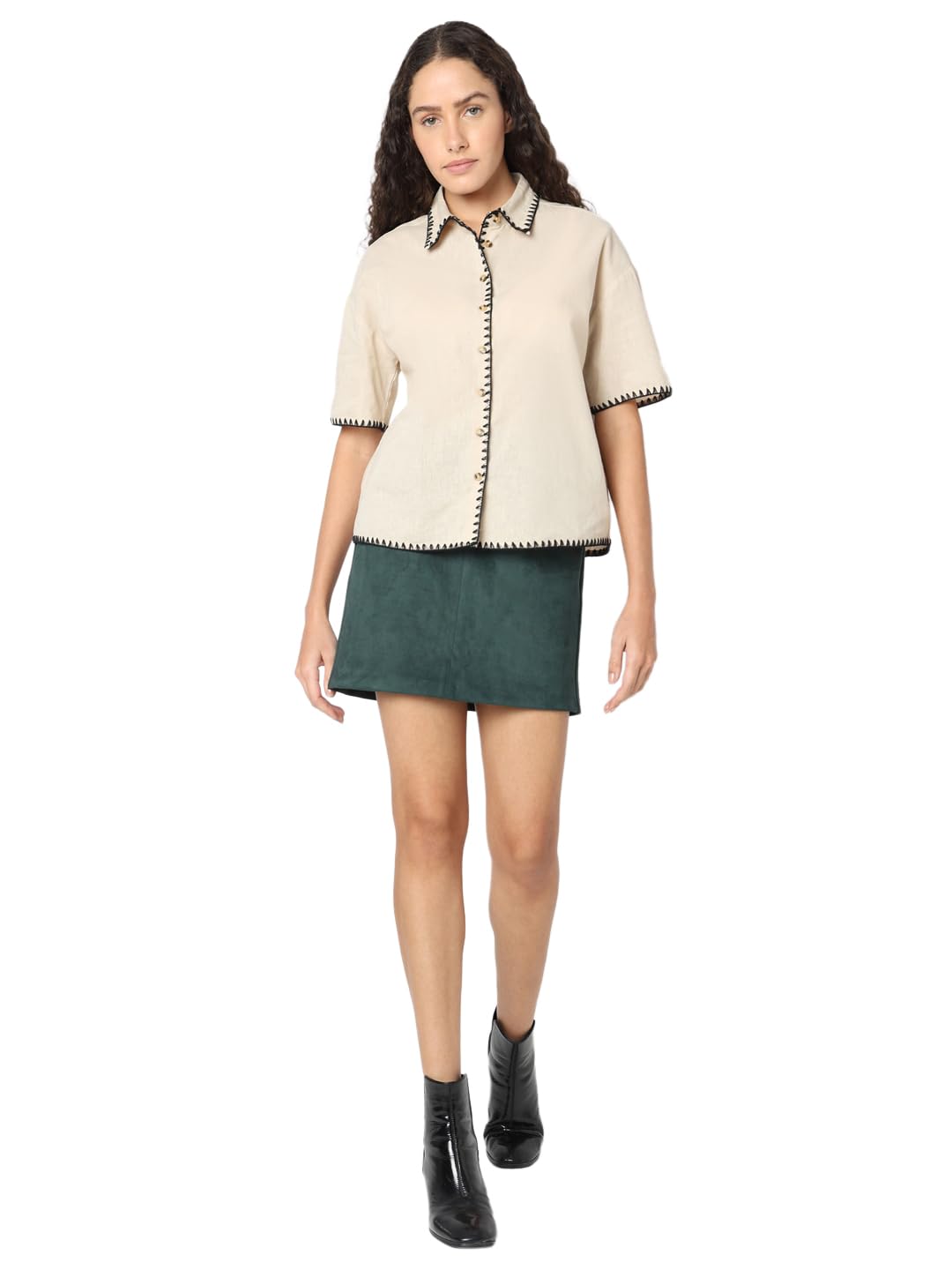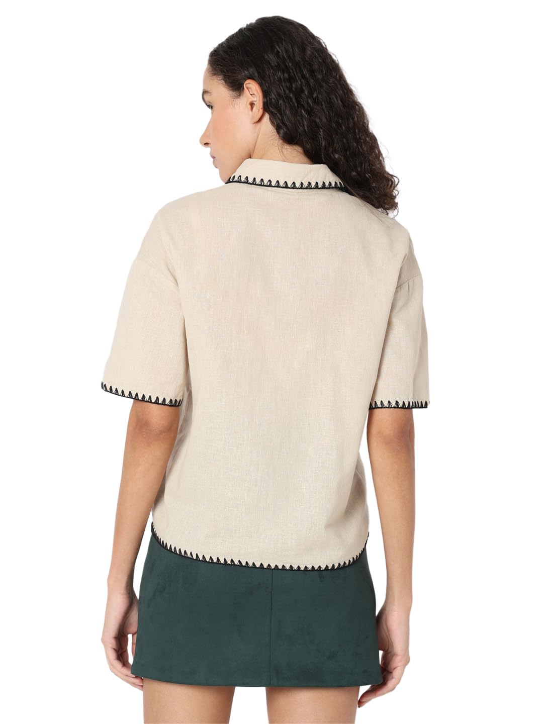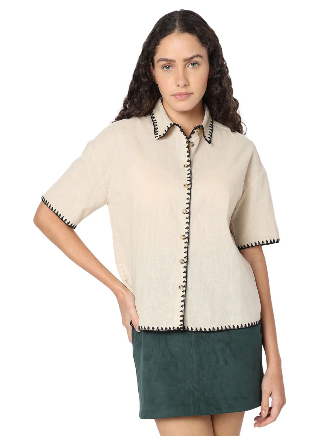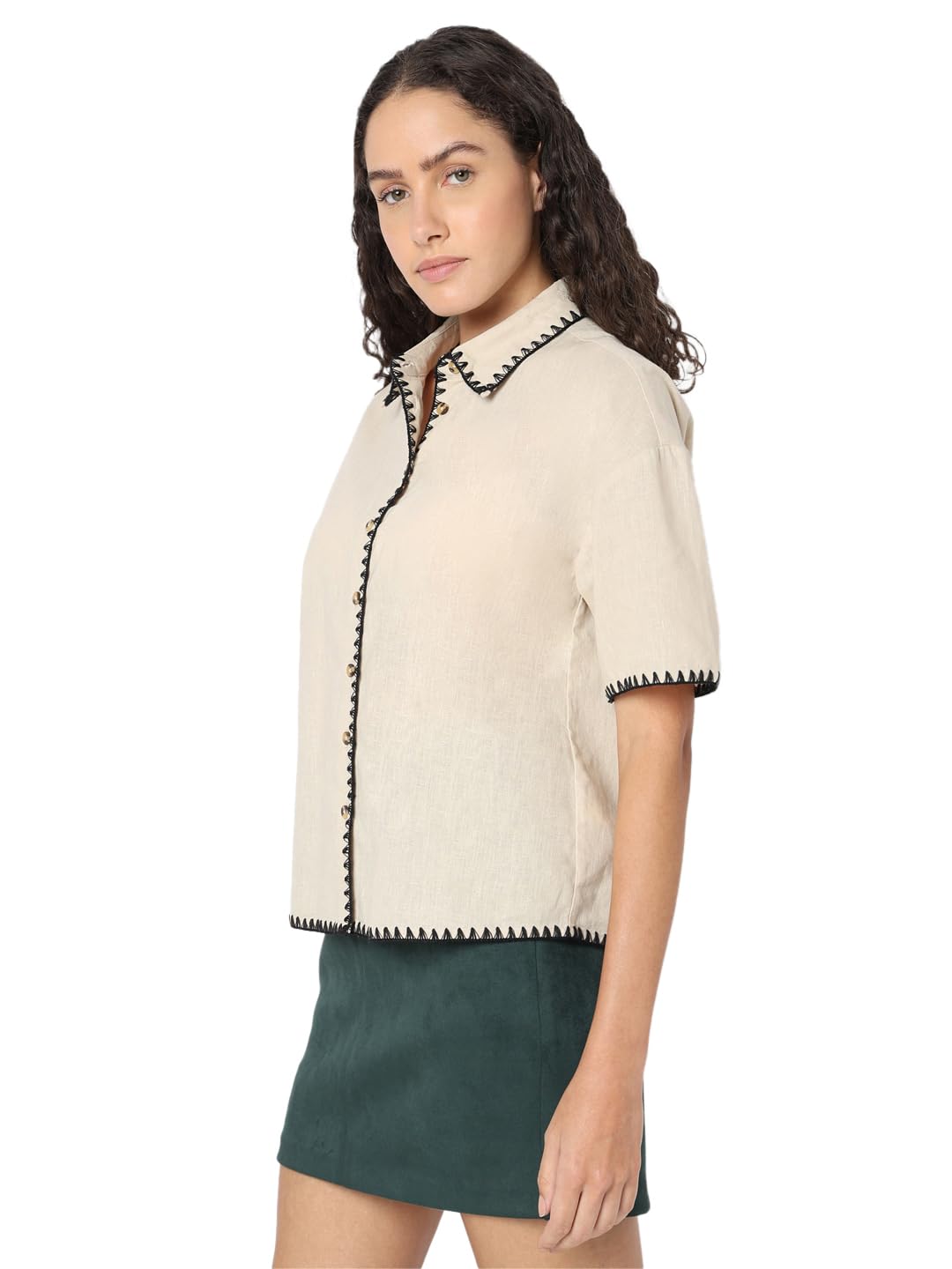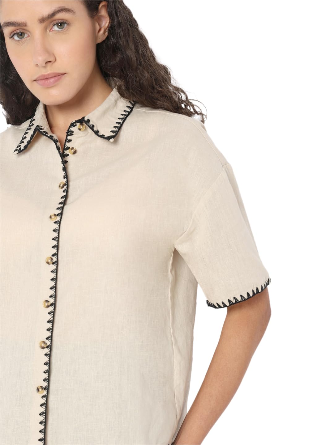 Elevate your shirt game with this stylish piece from VERO MODA. Crafted with attention to detail, this beige shirt features short sleeves and a classic shirt collar. The button closure adds a touch of sophistication while the white thread finish in triangular directional stitching along the hems of the sleeves, collar, and placket adds a subtle pop of contrast. This shirt falls at the hips for a flattering fit and has a boxy silhouette for a modern twist on a timeless staple. Pair this versatile shirt with high-waisted jeans and sneakers for a casual yet chic look, or tuck it into a pencil skirt and add heels for a more polished ensemble. Dress it up or down, this VERO MODA shirt is sure to become a wardrobe staple.